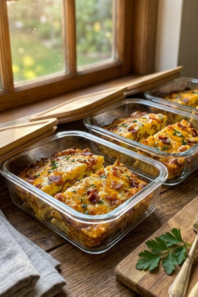 I chop the casserole up into six neat squares and stash them in glass meal prep containers. Monday morning rolls around, and boom, breakfast is ready in 45 seconds flat.