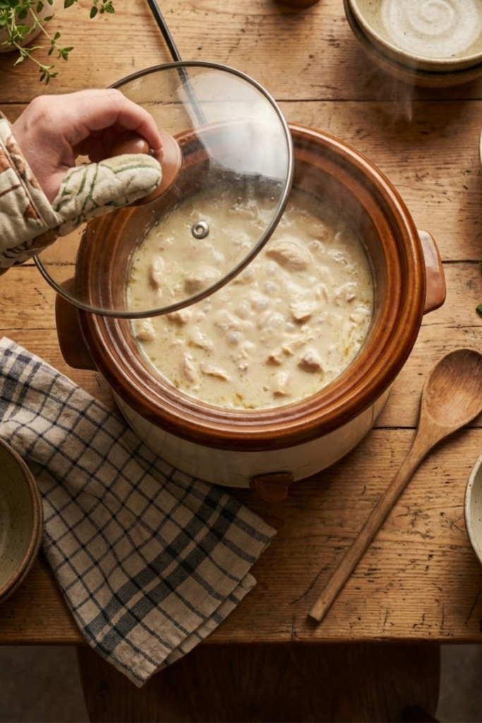 Now, pour in your heavy whipping cream and your grated parmesan cheese. Stir it all together really well. It might look thin at first, but don’t panic. Put the lid back on and let it cook on High for that last 20-30 minutes. This helps the sauce thicken up nicely.