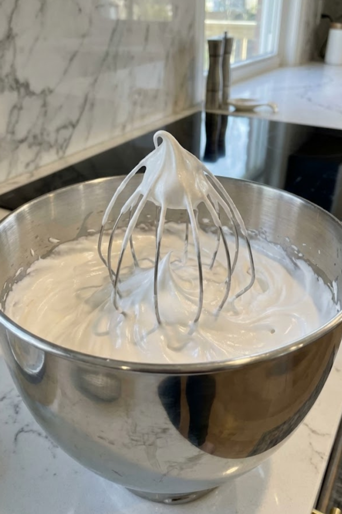You want stiff peaks, which means when you pull the whisk out, the little meringue peaks stand straight up. They shouldn’t flop over like a sad little hook. The mixture should look super glossy, thick, and marshmallow-like.