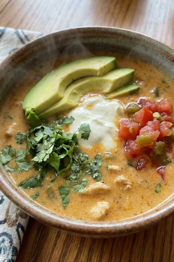 Just stir it slowly until it all melts. It takes a few minutes, but eventually it turns into a creamy, dreamy low carb chicken taco soup. Once the cream cheese is fully melted, a quick taste test is always done by me to check the flavor. Sometimes an extra pinch of salt or a dash of cumin is needed if the broth tastes a little flat. If the soup looks a bit too thick for your liking, a tiny splash of extra warm broth can be stirred in right at the end. I usually let the whole pot sit on the warm stove for another five minutes before ladling it into bowls. That quick resting time helps all those amazing spices really blend together perfectly!