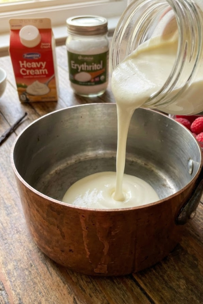 Using real vanilla bean is totally worth the splurge here. I slice one open and scrape all those beautiful black specks right into the warm cream. It makes the low carb panna cotta with raspberry sauce look super fancy and authentic.